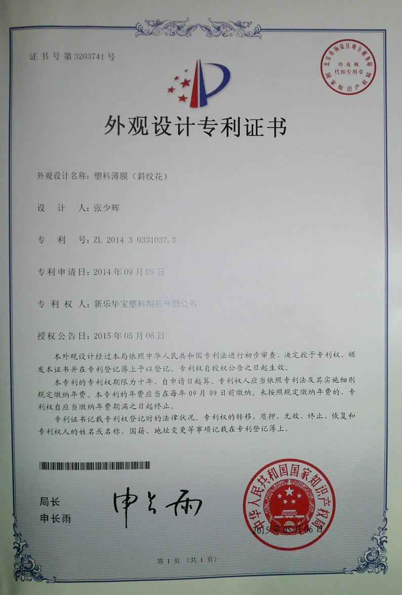塑料薄膜外觀(guān)設計專(zhuān)利證書(shū)(斜紋花)