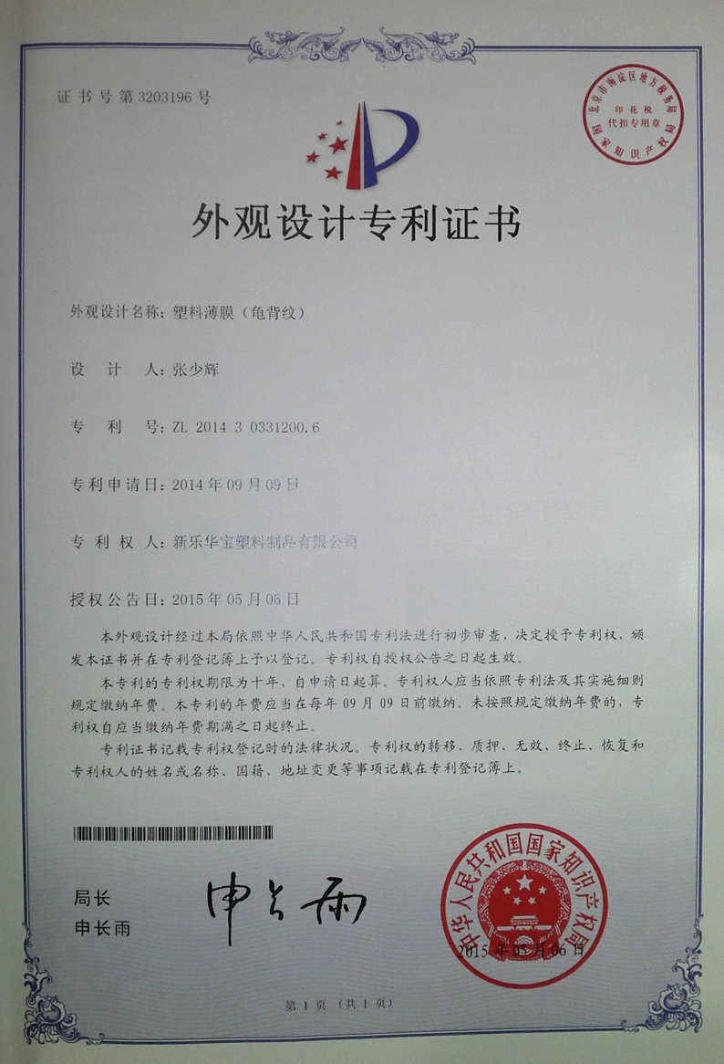 塑料薄膜外觀(guān)設計專(zhuān)利證書(shū)(龜背紋)