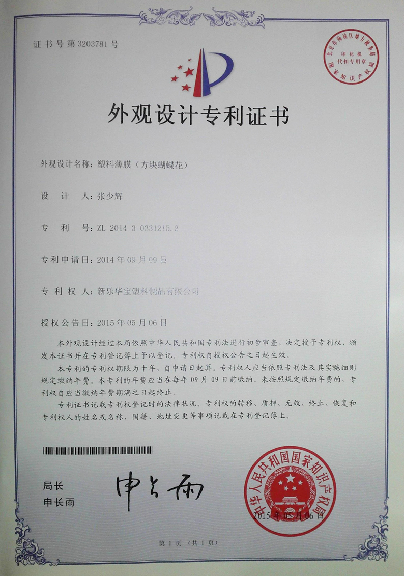 塑料薄膜外觀(guān)設計專(zhuān)利證書(shū)(方塊蝴蝶花)