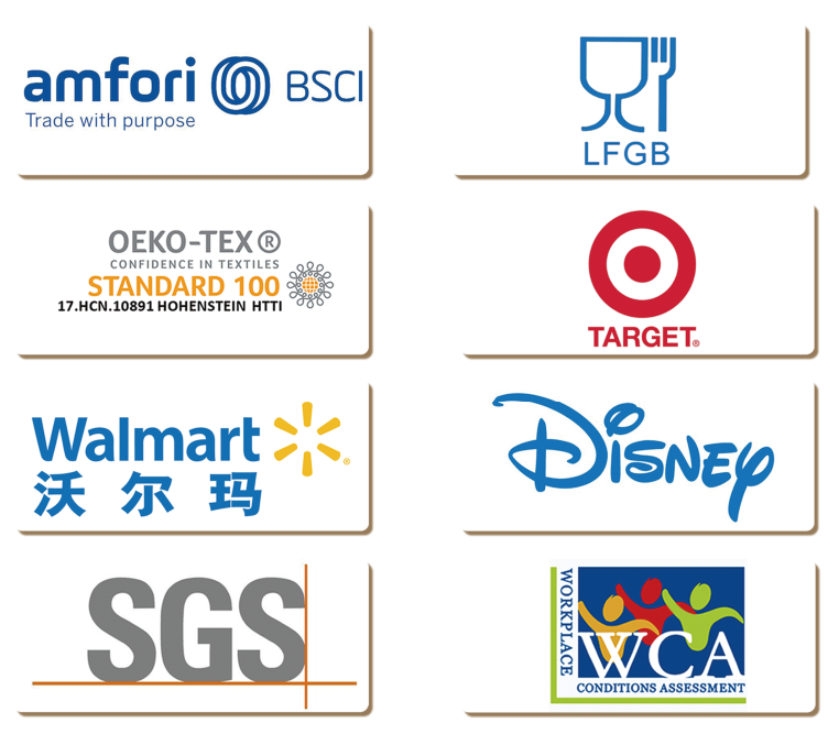 公司視產(chǎn)品質(zhì)量如生命,始終堅持“以創(chuàng )新誠信求生存,以品種質(zhì)量謀發(fā)展”的質(zhì)量方針。公司先后通過(guò)ISO9001:2015質(zhì)量管理體系認證、ISO14001:2015環(huán)境管理體系認證和知識產(chǎn)權管理認證;通過(guò)美國沃爾瑪驗廠(chǎng)、迪士尼驗廠(chǎng)、塔吉特驗廠(chǎng)及歐盟BSCI認證;產(chǎn)品通過(guò)歐洲Oeko-Tex standard 100生態(tài)紡織品1類(lèi)(嬰幼兒)產(chǎn)品認證、WCA、SQP認證;產(chǎn)品通過(guò)SGS檢測及BV檢測,未發(fā)現增塑劑、雙酚A、福爾馬林等有害物質(zhì);有害重金屬及有害物質(zhì)符合歐盟EN 71玩具安全標準,符合美國ASTM F963玩具標準;產(chǎn)品材料符合德國LFGB食品接觸材料管理法、歐盟Reach法規、ROHS指令的相關(guān)環(huán)保標準;抗靜電性能符合歐盟EN 1149抗靜電檢測標準。