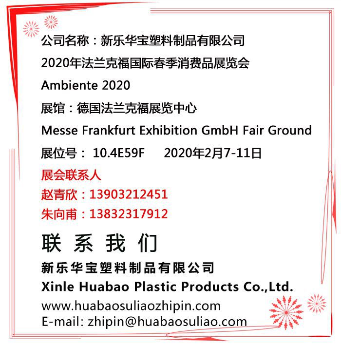 2020年法蘭克福國際春季消費品展覽會(huì )/20.2.7-11/10.4E59F/誠邀您的參加! 上一個(gè):全球抗新冠,華寶在行動(dòng) 下一個(gè):【拼搏2020】華寶集團2019總結表彰暨2020迎新晚會(huì )圓滿(mǎn)結束