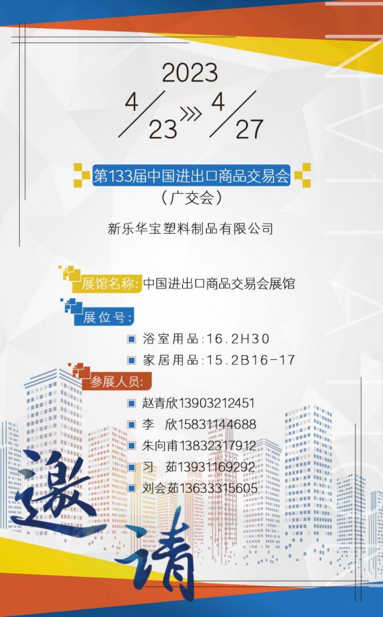 廣交世界,互利天下,新樂(lè )華寶塑料制品二期展位號:浴室用品16.2H30 /家居用品15.2B16-17 上一個(gè):2023第16屆寧波國際塑料橡膠工業(yè)展覽會(huì ) 下一個(gè):叮咚丨新樂(lè )華寶塑料制品有限公司3月份展會(huì )速遞