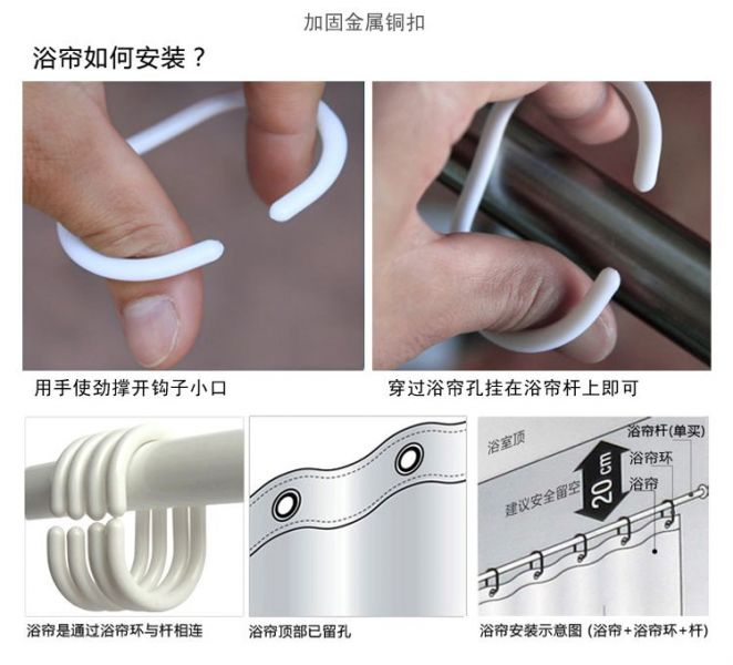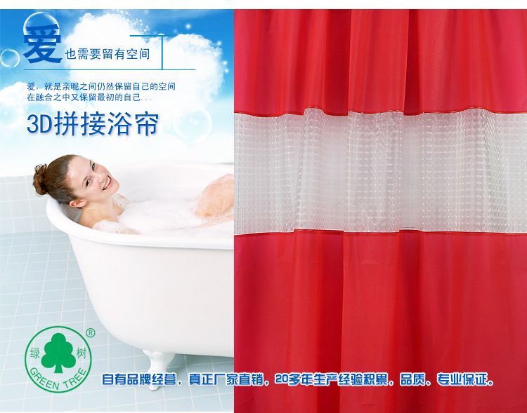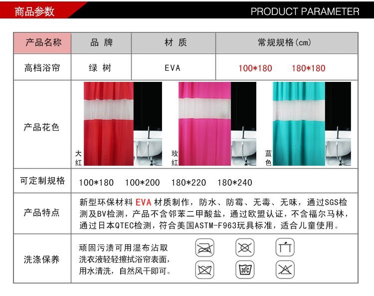 【材質(zhì)】: EVA,環(huán)保,不含鄰苯二甲酸鹽,對人體沒(méi)有危害 【規格】:140*200cm, 170*200cm, 【特點(diǎn)】:浴簾美觀(guān)高雅,時(shí)尚個(gè)性,防水,帶給您非凡的品味生活